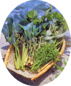 あんぼ 米の粉をこねて旬の山菜や野菜をくるんだもので、こげめがつくくらいこんがり焼くと、香りと味わいが増します。 |